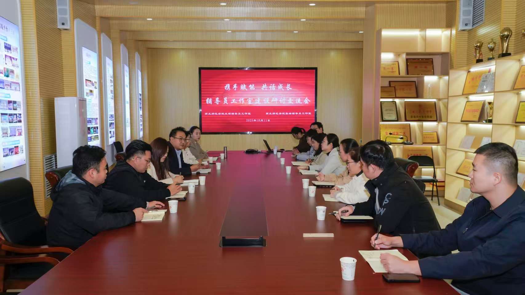 为深入推进辅导员队伍专业化、职业化建设,共享工作室建设经验,2025年10月11日,以“携手赋能 共话成长”为主题的辅导员工作室建设研讨交流会在音乐学院艺术展厅成功举办。商丘师范学院王頔辅导员工作室、张瑞辅导员工作室全体成员参会,共话育人心得,共绘成长蓝图。