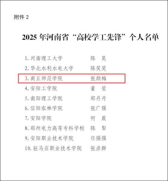 近日,中共河南省委宣传部、河南省教育厅印发《关于公布2025年河南省“高校学工先锋”评选结果的通知》(教学〔2026〕6号),我校张颜梅老师经组织推荐、现场答辩、实地考察等环节,荣获河南省首届“高校学工先锋”个人荣誉称号。