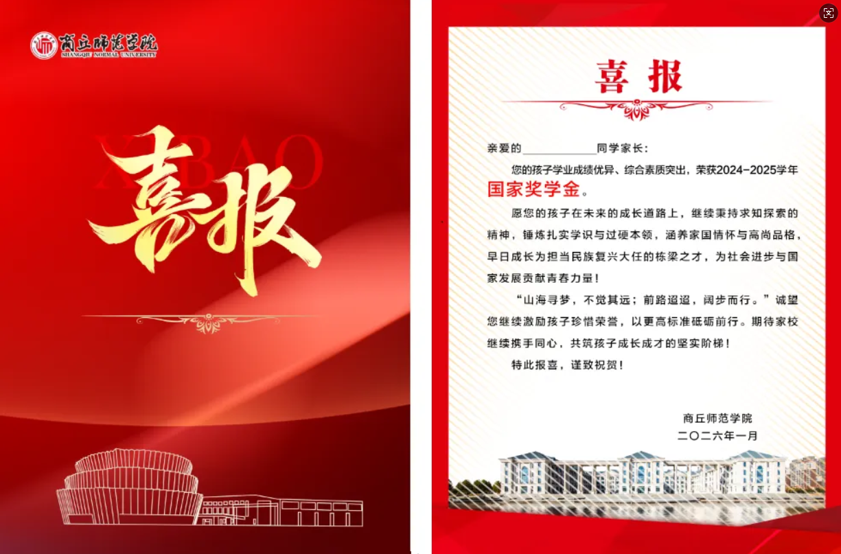 一纸喜报,不仅承载着学子的奋斗荣光,更凝聚着家校共育的初心。商丘师范学院将继续秉持“以生为本”的育人理念,以更丰富的载体、更暖心的举措,照亮每个学子的成长征途,为社会培育更多有理想、敢担当、能吃苦、肯奋斗的栋梁之才。